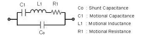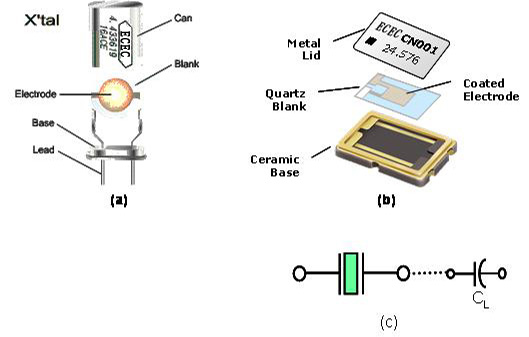(图七)(a)及(b)分别是DIP型式及SMD型式的石英振荡子的基本结构图. (图七)(c)是电子电路上所使用代表石英振荡子的电子符号. 当石英晶体共振子处在远离振荡频率区域时, 石英晶体共振子仅是一个电容性的组件, 当频率接近石英晶体的振荡频率时, 就接近是一个电感性的等效LCR振荡线路.