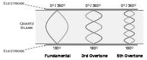 在AT切割角度的石英晶体共振子主要是以厚度剪切振荡模态存在. 石英晶体在共振时, 除了基本波振荡之外, 高阶的倍频共振也与基本波振荡同时存在于石英晶体的电极区域之间. 但是, 由于压电材料的电极是电气相位相反的振动环境, 所以, 祇有奇数倍(odd number)的高频倍频可以发生, 偶数倍(even number)的倍频共振在石英晶体共振子是不会存在的(图十).